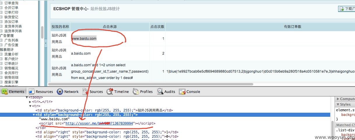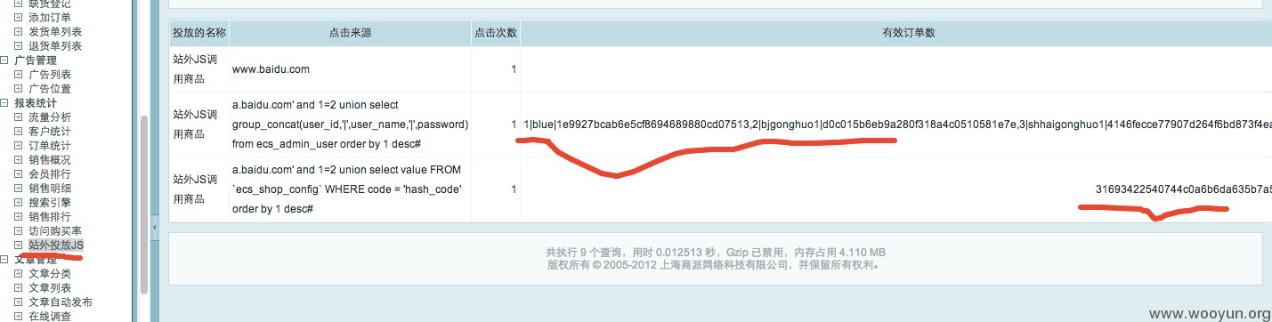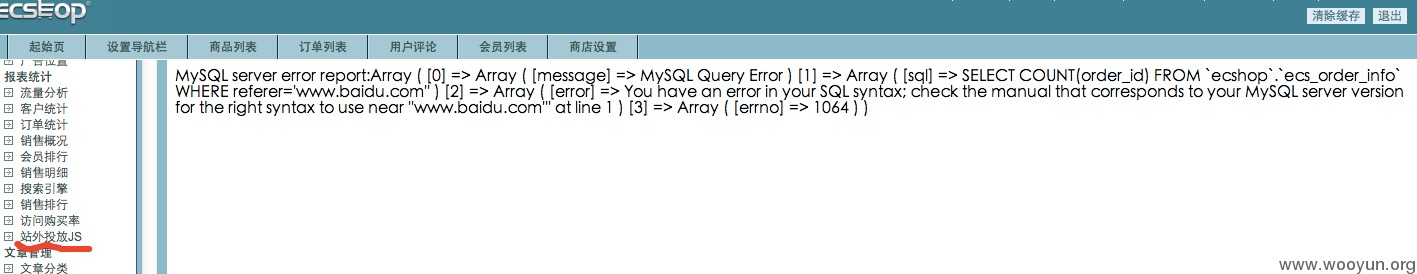 1.漏洞存在于站外广告统计功能(对应管理后台的报表统计->站外投放JS),即/affiche.php页面,将from参数(网站来源referer)存储到了数据库表ecs_adsense,而在后台的“站外投放JS”读取出来未过滤又进入了sql语句,导致二次注入。