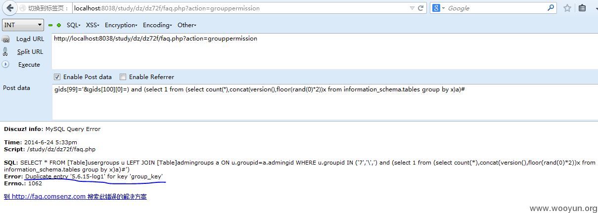 到http://domain/faq.php?action=grouppermission就可以触发SQL注射了。
