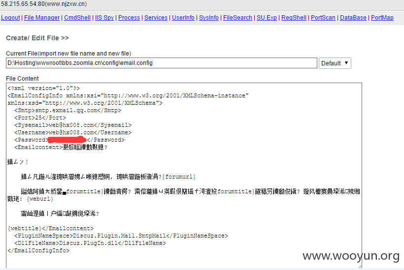 通过查看,该应用所属权限较高,可以控制该服务器挂的几十个大小网站,发现其中有一个bbs.zoomla.cn的官方老版论坛也在该服务器,并且配置公司邮箱账户密码:
