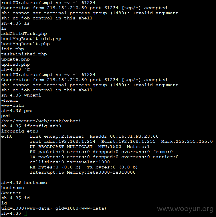通过验证,这里是www权限,但是可以执行php 所有我们用php反弹一个shell出来 首先下载php文件到tmp目录,其他目录均没有写权限 而且会转义单双引号,所以我们使用下载远程vps上的shell脚本 脚本内容为反弹shell: